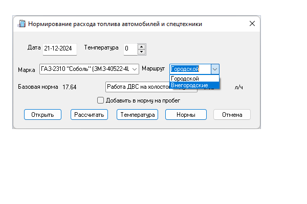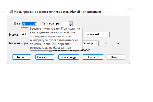 Программа предназначена для оперативного корректирования дифференцированных маршрутных норм предприятия. Она позволяет корректировать величину маршрутных норм в любое время с учетом низкой температуры окружающего воздуха. Программа автоматически ведет статистику температур и сохраняет ее для дальнейшего использования. Это позволяет в случае отсутствия необходимых данных о температуре воздуха воспользоваться данными из базы за аналогичную дату прошлых зимних периодов. Программа работает под управлением любой 32-х разрядной операционной системы Windows, например, Windows 95, Windows 98, Windows ME, Windows NT.Работа с программой