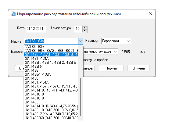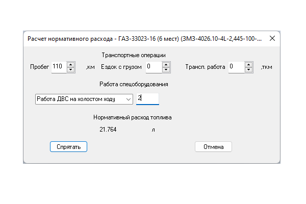 Рис. 6. Панель расчета нормативного расхода топлива автомобилем