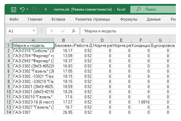 При нажатии кнопки [Нормы] список рассчитанных норм по всем автомобилям предприятия или фирмы будет сохранен в формате MS EXCEL в папке программы и откроется для редактирования в соответствующем приложении, если оно установлено на компьютере.