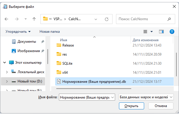 Программу можно подключить к файлу базы нормирования в формате SQLite, содержащему необходимые для работы приложения CalcNorms таблицы, нажав кнопку "Открыть" основной панели (рис. 9).