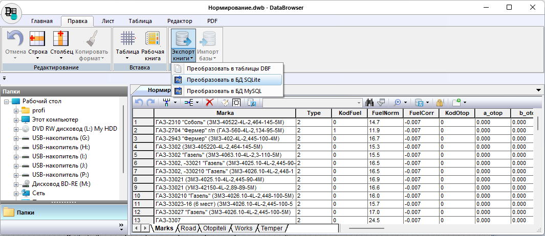 Данные, необходимые для работы программы корректирования, могут быть отредактированы с помощью открытия таблиц с данными в Microsoft Excel. Можно подготовить данные и создать базу(ы) нормирования сразу в авторском приложении DataBrowser это табличный процессор, который может конвертировать таблицы своего формата в базу данных SQLite, поддерживаемую программой CalcNorms (рис. 8).